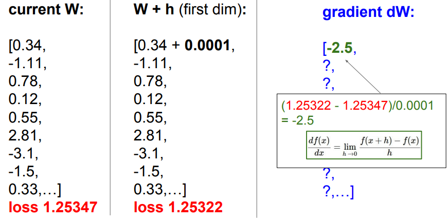 - W의 첫 번째 요소 w1에 아주 작은 값 h를 더한 새로운 파라미터 W'로 손실 함수 L(W')를 다시 계산함