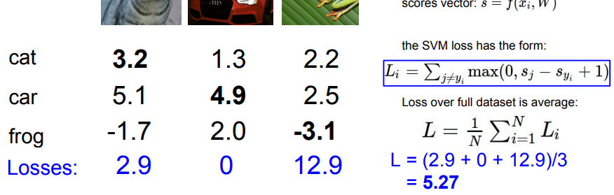 - 정답 클래스의 스코어가 가장 클 때 모든 샘플에서 Loss가 0이 되기 때문에 최솟값은 0