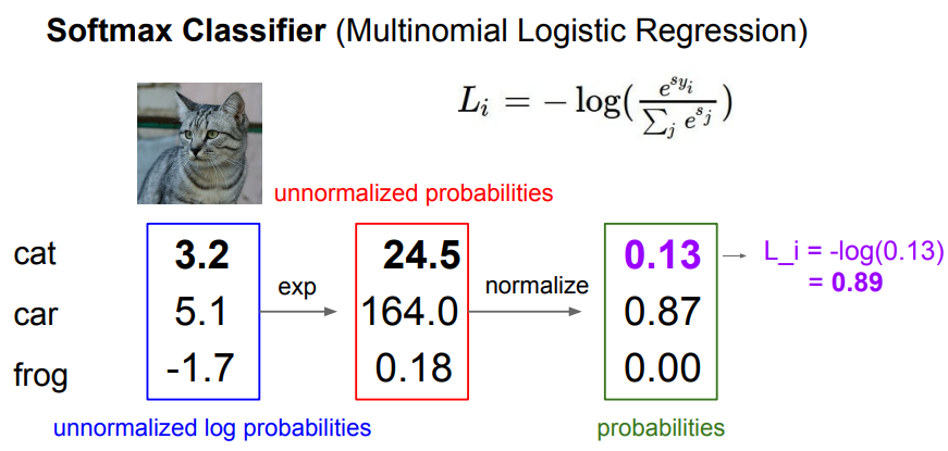 - 앞서 Multi-class SVM loss에서는 정답 클래스 스코어와 나머지 클래스 스코어의 차이만을 고려할 뿐 스코어 자체에 대한 해석은 고려하지 않았음