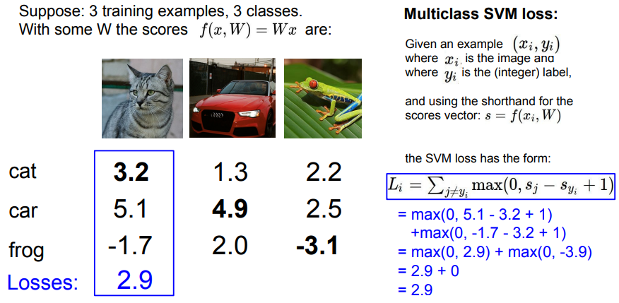 - SVM 손실 함수는 정답 스코어와 그 외의 스코어 간의 차이만 고려함. Car 스코어가 이미 다른 스코어들보다 매우 높다면, 스코어를 조금 바꾼다고 해도 margin이 여전히 유지되므로 Loss는 변하지 않고 계속 0일 것임