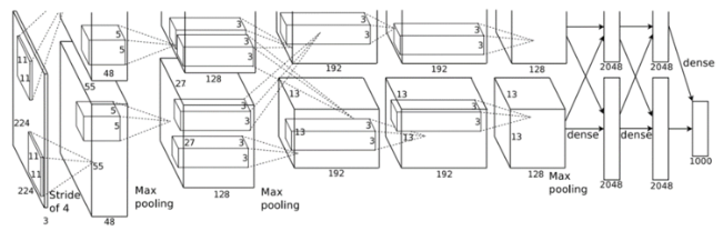 - 컨볼루션 레이어 후 3개의 FC 레이어 (4096 → 4096 → 1000). 마지막 레이어는 소프트맥스 레이어