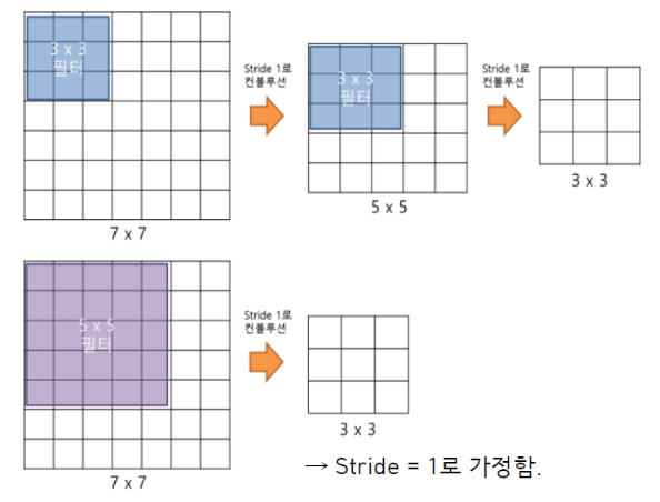 - 중간에 다른 pooling이 없다고 가정했을 때 컨볼루션 결과 출력 크기 관점에서 3x3 필터 두 번 사용 = 5x5 필터 한 번 사용, 3x3 필터 세 번 사용 = 7x7 필터 한 번 사용하는 것과 같음