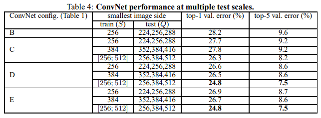 - 정리하자면 학습 시 사용되는 이미지는 결국 리스케일링 후 224x224로 random crop 되어야 하는데, 이때 리스케일링 방법을 single-scale, multi-scale 둘 중 하나의 방법으로 S의 값을 제한함으로써 정할 수 있음