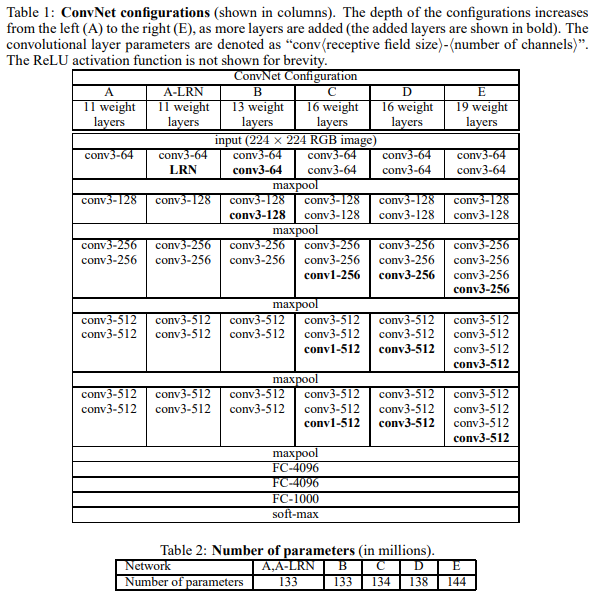 - 표 1은 논문에서 평가된 ConvNet 구성(A에서 E)을 보여주고 모든 구성은 앞선 아키텍처를 따르며 깊이에서만 다름